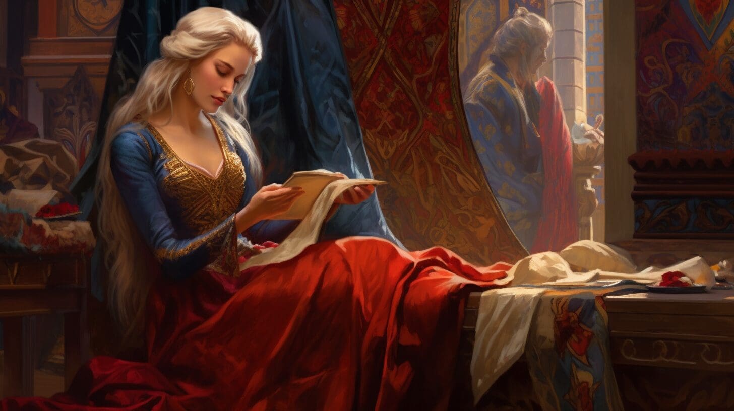 Lancelot’s aunt, Evaine Redfield, is a calming, motherly influence on the court. In her youth, she had been an accomplished horsewoman and often rode with Lancelot in his younger days. A calm and measured influence on the court, Evaine advises wisely and well. She has nursed Lancelot through several inappropriate romances. Being so like her late brother in temperament, it was little surprise that she had taken up painting and needlework as a hobby.
